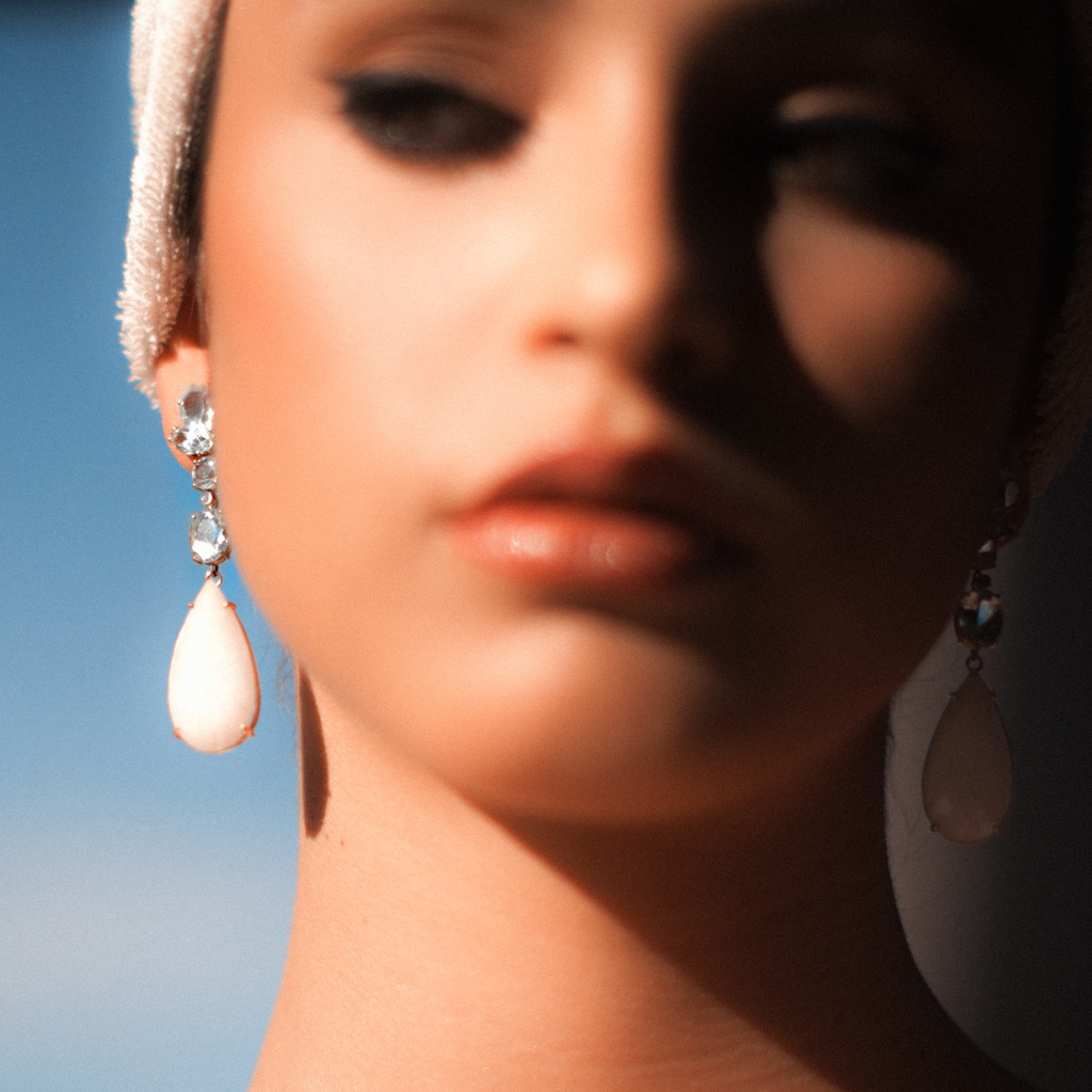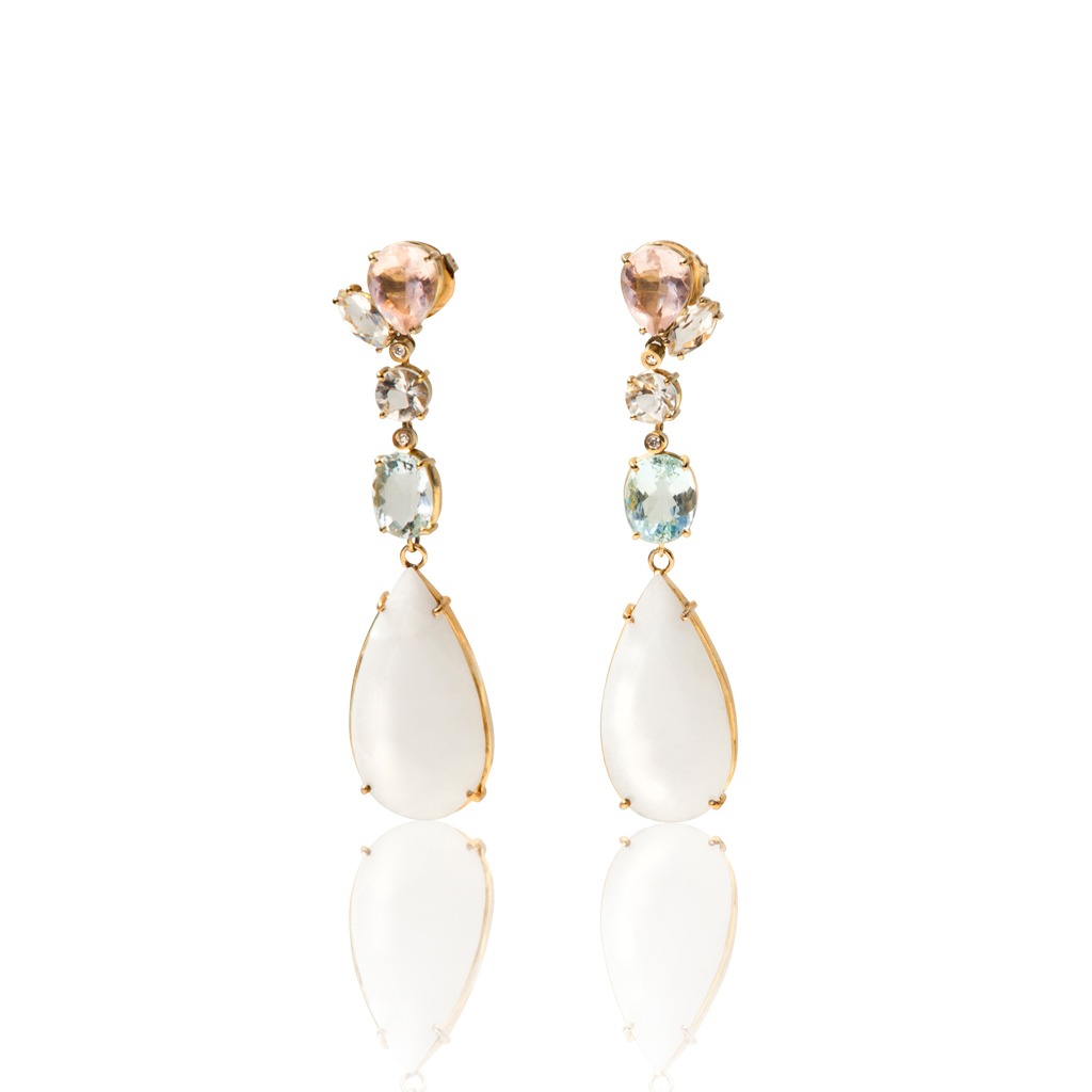 Aros de Oro Amarillo 18 K (Quilates) con gemas de Quartzo rosa, Cristal de Roca, Ametistas, Brazolita, gotas de Onix Blanco y Brillantes