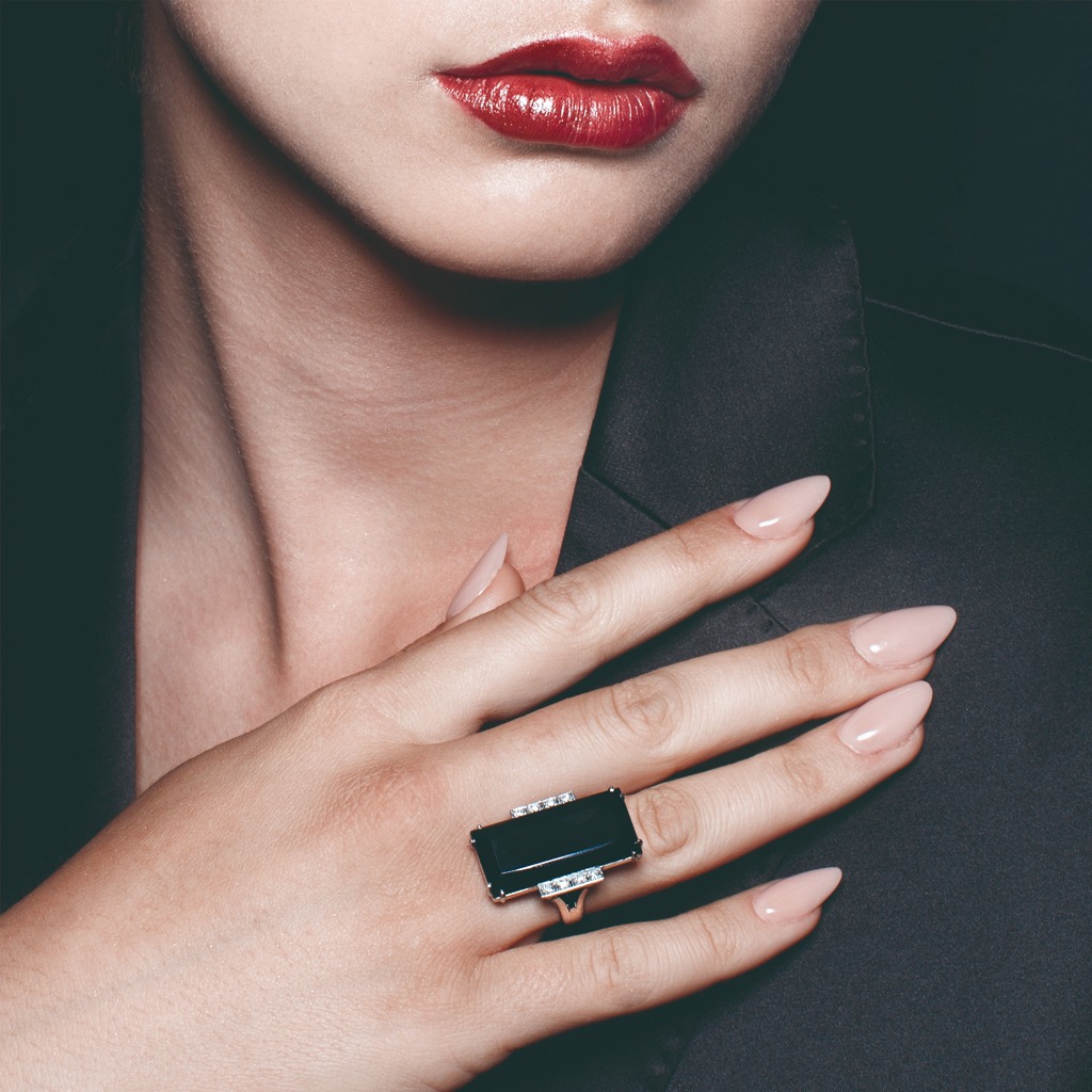 Anillo de Oro Blanco 18 K (Quilates) con Onix Negro en forma rectangular y Brillantes