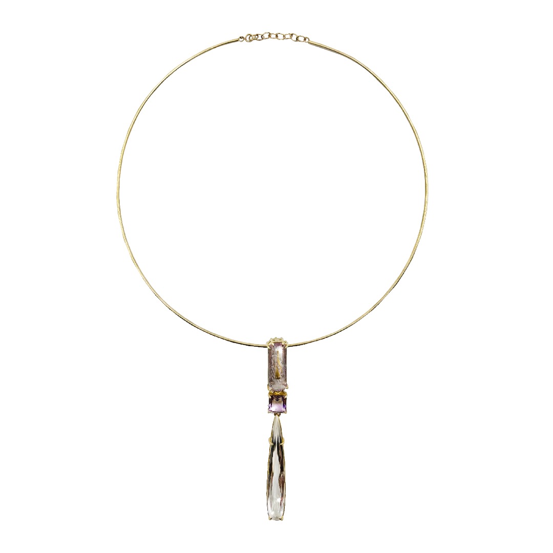 Collar de Oro amarillo 18K con gemas Kunzita, Ametistas y gota de Cristal de Roca